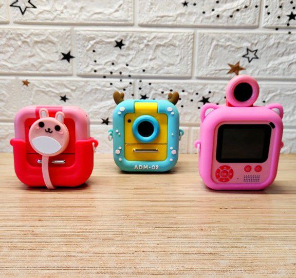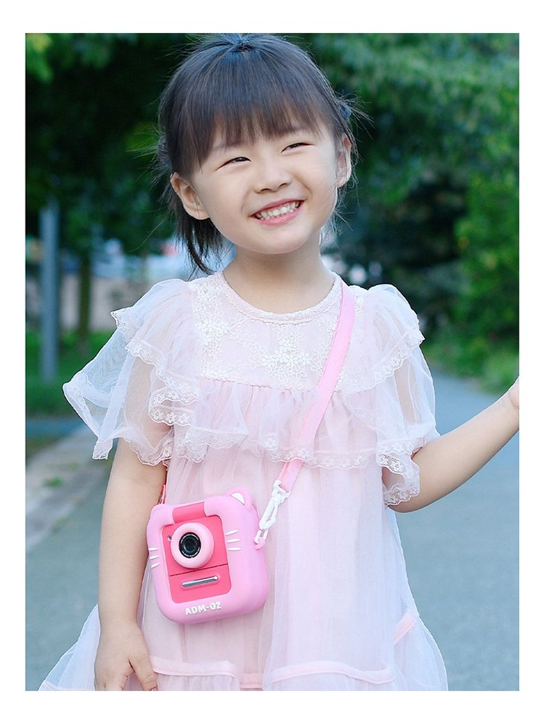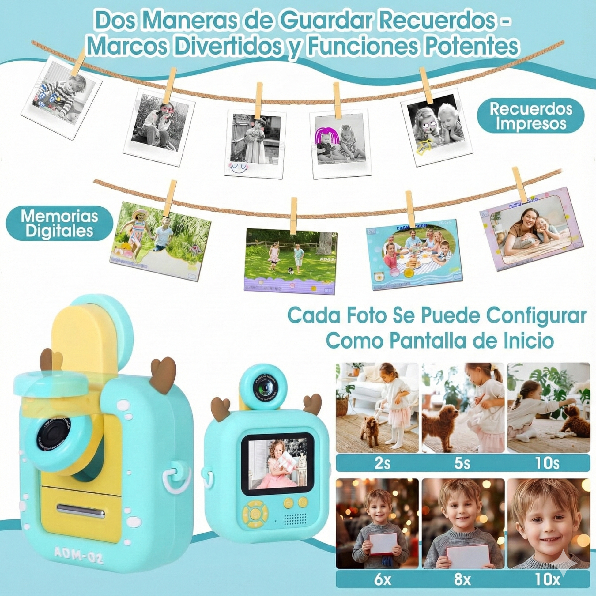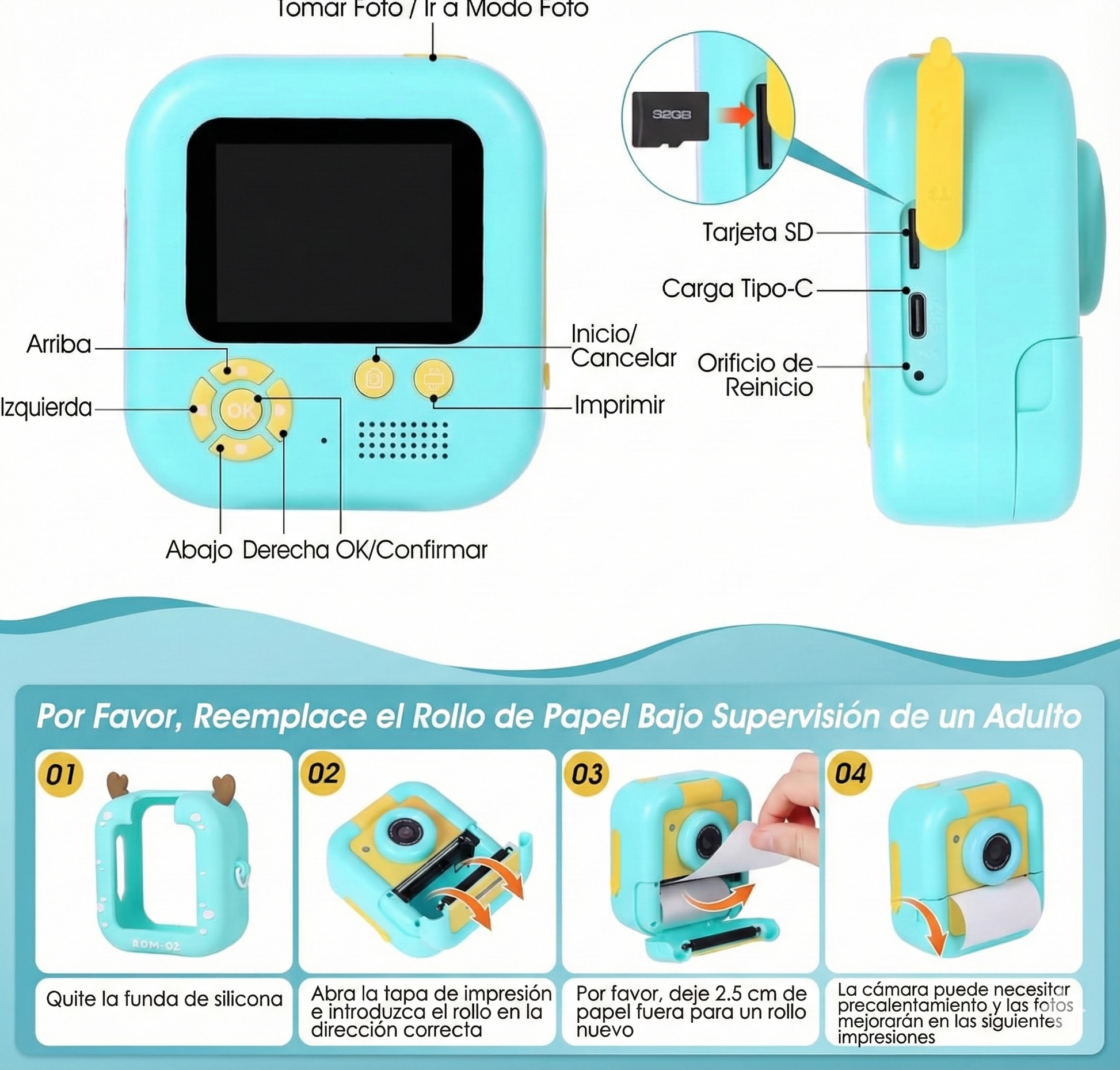 "La cámara es muy bonita, ¡a la niña le encanta! Además, la funda la protege... La calidad de las fotos digitales es muy alta y la posibilidad de girar el objetivo para autorretratos es excelente. La impresión, incluso en blanco y negro, es buena, pero hay que dejar que la cámara se caliente y tener cuidado al cargar papel nuevo. El menú es intuitivo y fácil de usar para niños. La verdad es que los colores no son muy útiles, pero las pegatinas son muy bonitas. Excelente relación calidad-precio, muy adecuada para niños."